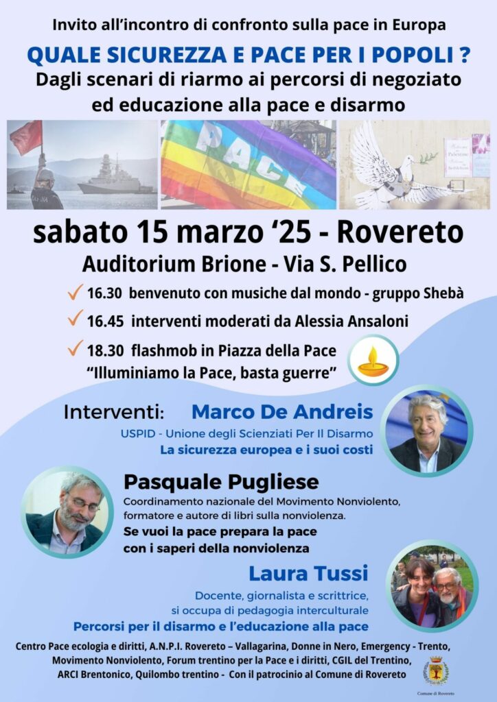 L’incontro vede il patrocinio al Comune di Rovereto ed è promosso da una rete di associazioni tra cui il Centro Pace ecologia e diritti di Rovereto, CGIL del Trentino, Donne in Nero Rovereto, Emergency gruppo Trento, Forum trentino per la Pace, Movimento Nonviolento sez. Trentino, A.N.P.I. Rovereto – Vallagarina, ARCI Brentonico, Quilombo trentino.