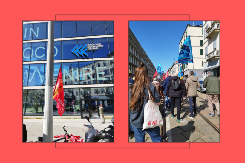 Con tutti i suoi difetti, il tobleronico edificio della Fondazione Feltrinelli a Milano è un posto perfetto dove far partire un corteo. L’algida piazza davanti all’ingresso sembra fatta apposta per essere invasa da scarpe da ginnastica, bandiere, striscioni, fumogeni e da una playlist, dai Lunapop ai Depeche Mode, che esce da una cassa tirata da una bicicletta. Sulle vetrate della Fondazione, pulitissime come sempre, si riflettono le figure dei manifestanti che arrivano alla spicciolata, mentre la citazione di Ferruccio Parri a lettere cubitali sulla facciata – È IN GIOCO L’AVVENIRE – si presta ad automatici détournement. I sindacati di librai e libraie Feltrinelli (Filcams CGIL, Fisascat CISL e Uiltucs) hanno convocato il concentramento per il corteo qui il 17 marzo perché contemporaneamente era prevista una Convention di due giorni per i settant’anni dell’editore. Convention poi ridotta a un giorno solo, il 18. La mattina di sole dopo tanti giorni di pioggia sembra confermare che è comunque il giorno giusto per scioperare.