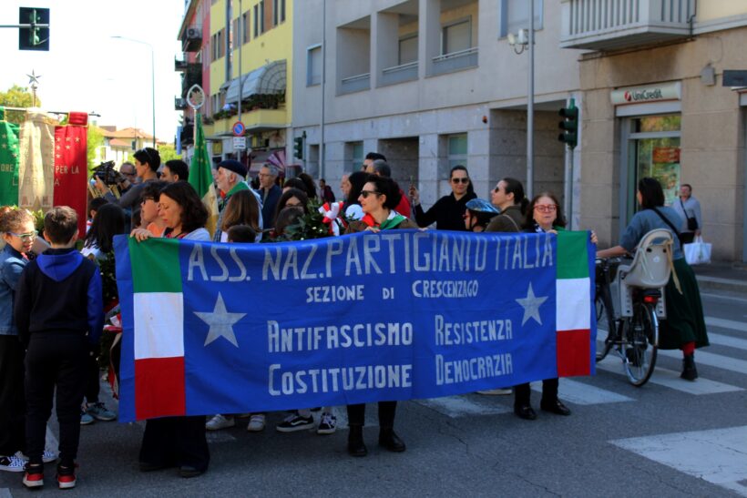 Arrivata in piazza Costantino, luogo di ritrovo della manifestazione indetta dalle due sezioni Anpi Crescenzago e 10 agosto 1944 mi ritrovo circondata da una folla di centinaia di persone di tutte le età: famiglie con bimbi piccoli, bambini un po’ più grandicelli in bici, ragazzi e via via fino agli anziani dall’energia inarrestabile e contagiosa come Giuseppe Natale, che mi aveva già invitato a un incontro sui media e la tragedia di Gaza. Il tutto davanti a Casa Crescenzago, storico edificio sede di tante associazioni di quartiere. E’ tutta gente che si conosce ed è abituata a ritrovarsi per iniziative di quartiere e non solo; lo si capisce subito dall’atmosfera familiare e gioiosa. La consapevolezza del genocidio a Gaza è presente fin dall’inizio con il discorso di Khadher Tamini, presidente della comunità palestinese in Lombardia, che interviene in piazza Costantino perché richiesto poco dopo in altre iniziative.