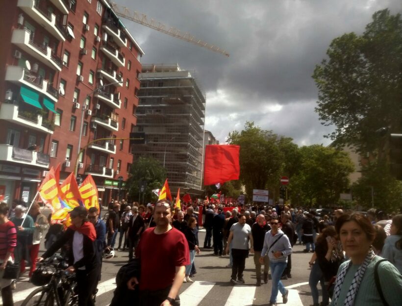 Un grande striscione di pace portato dallo spezzone vicino ai giovani comunisti contrasta molto con il voto compatto degli eurodeputati PD favorevole al programma per l’industria europea della difesa proposto da Ursula!