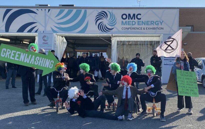 La conferenza OMC Med Energy è dedicata al ruolo del gas nella transizione energetica e nella creazione di alleanze industriali per cercare soluzioni innovative finalizzate alla decarbonizzazione di settori ‘difficili’ come cementifici e raffinerie. La pacifica protesta sottolinea come le numerose aziende collegate all’industria fossile che partecipano alla conferenza, tra cui Eni, Snam, TotalEnergies e Shell, siano tra i principali responsabili dell’aggravarsi della crisi ecoclimatica. Negli ultimi mesi infatti i giganti del fossile hanno fatto marcia indietro sui loro impegni riguardo alla decarbonizzazione. In dicembre la Shell ha annunciato una riduzione dei propri investimenti nelle energie rinnovabili e un maggiore impegno nell’estrazione di gas fossile. ENI, il colosso italiano del gas e del petrolio, che sul suo sito enfatizza il proprio impegno green, dal 2023 al 2024 ha aumentato di meno di 2 gigawatt la propria capacità installata di rinnovabili, passando da appena 3 GW a 4,1 GW. Nello stesso periodo, la sola produzione di gas peserà per il 60% del portafoglio aziendale. Allo stesso tempo ENI promuove come soluzione alla crisi del clima la Carbon Capture and Storage (CCS – cattura e stoccaggio della CO2), a partire dai progetti di Ravenna e Hynet nel Regno Unito, mentre secondo molti esperti si tratta di una tecnologia sperimentale e costosa, inadatta a fronteggiare l’emergenza climatica.