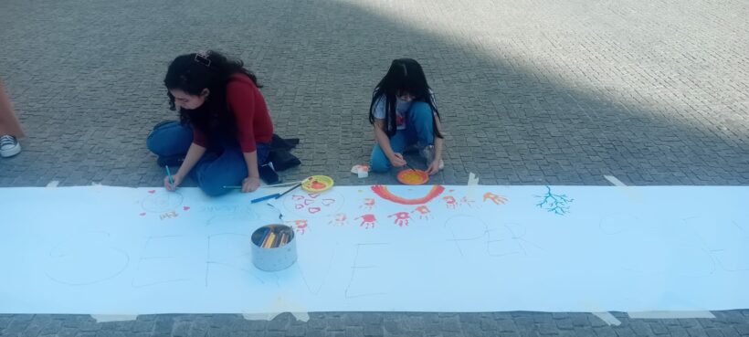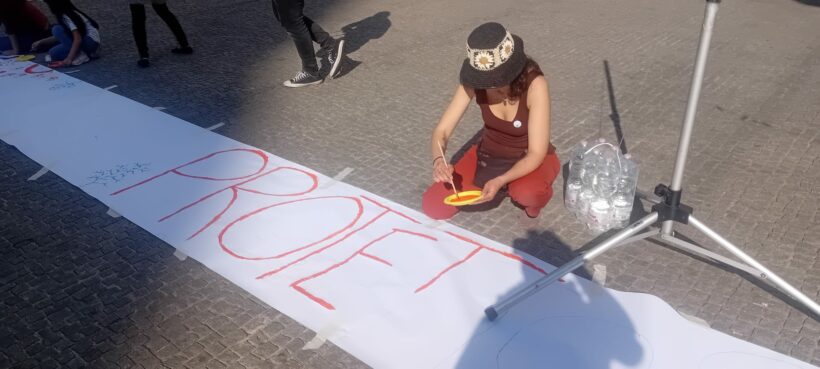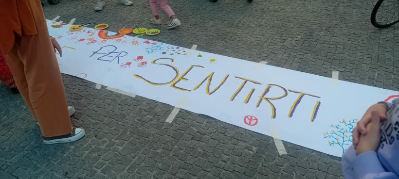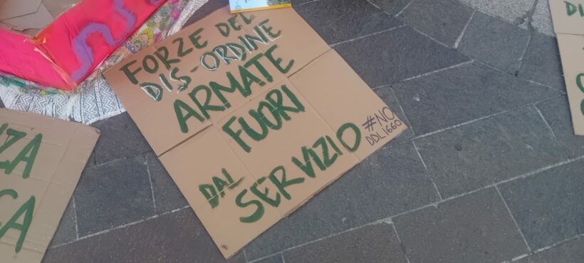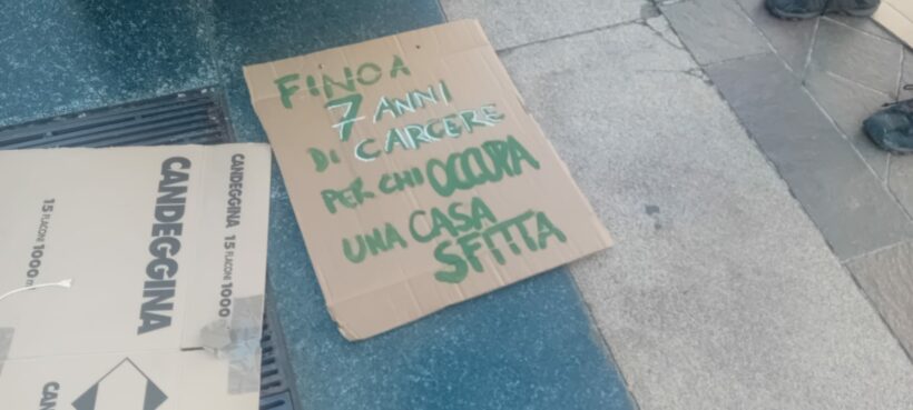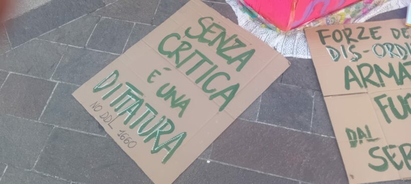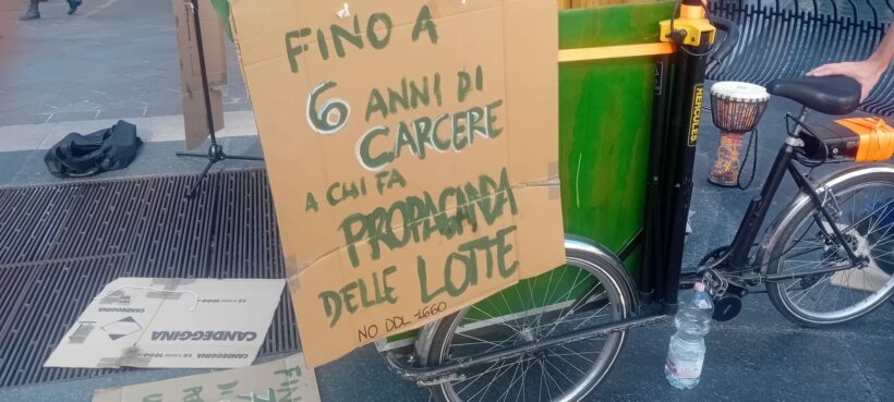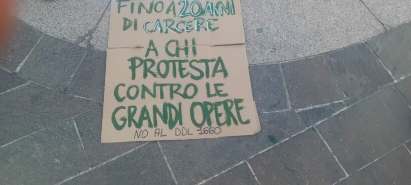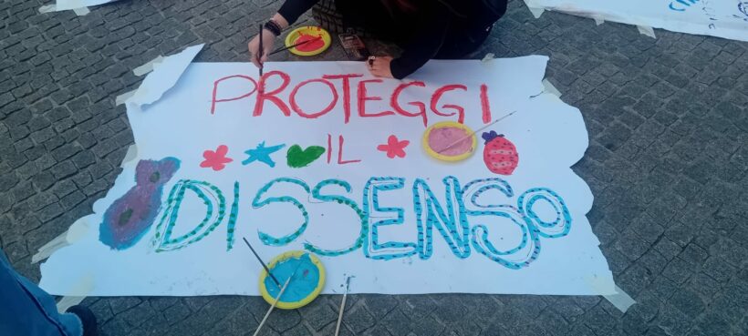 Stoffe e lunghe strisce di carta a terra, pitture, piattini e pennelli: grandi e piccoli alle prese con scritte che prendono in giro un decreto sicurezza che crea insicurezza, che toglie diritti e libertà. Da un microfono musica e interventi, anche poetici, si alternano. Molta gente si ferma, la comunicazione funziona. Cartelli che sintetizzano bene gli anni di galera che si rischiano per sostenere una lotta, occupare una casa, protestare contro le grandi opere. In piazza ci sono sorrisi, allegria, ma sotto sotto viene la pelle d’oca.