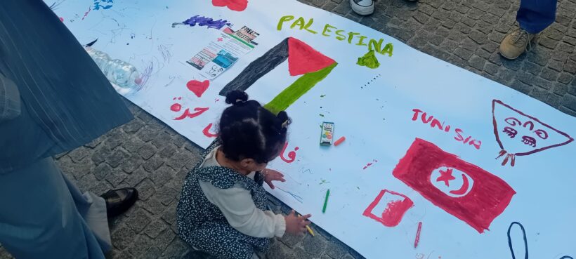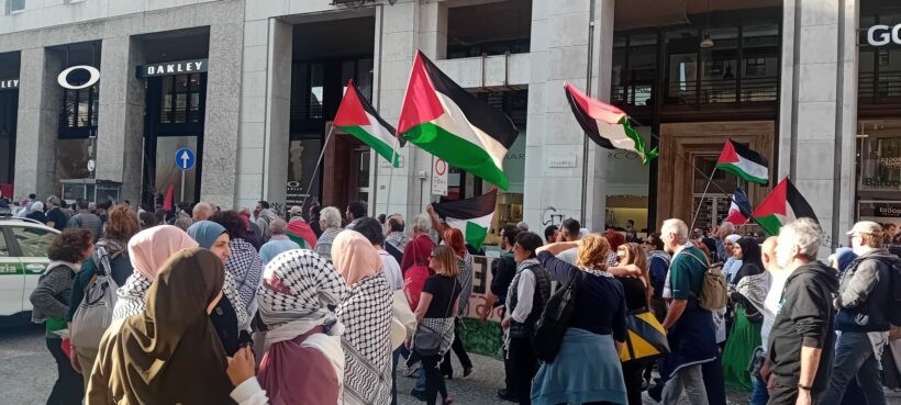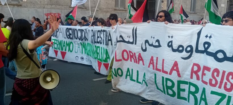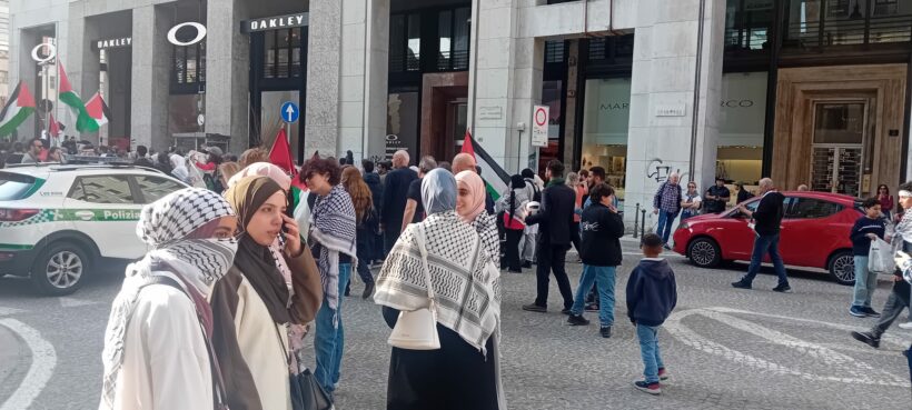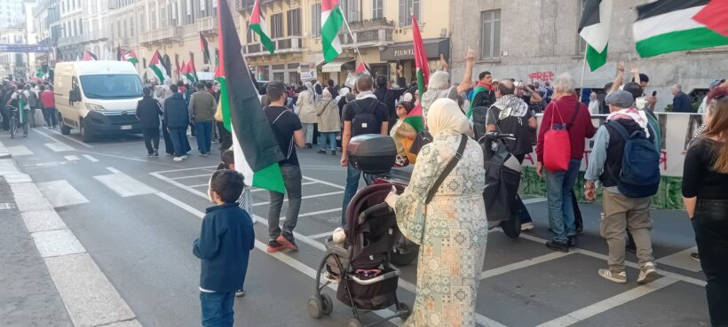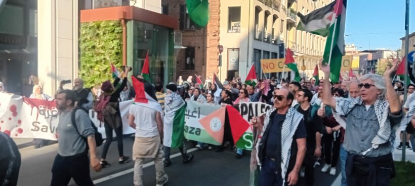 Poche centinaia di metri più in là, da Porta Venezia (dove già si respira l’aria del 25 aprile), parte il corteo per la Palestina. I numeri non sono alti, un migliaio di persone, ma l’energia è tanta: gli slogan si susseguono, tutti e tutte gridano. Col bel tempo si vedono molte più famiglie, donne, bambini. Sono anche loro che prendono il microfono e pretendono pace, giustizia e libertà nella terra più amata.