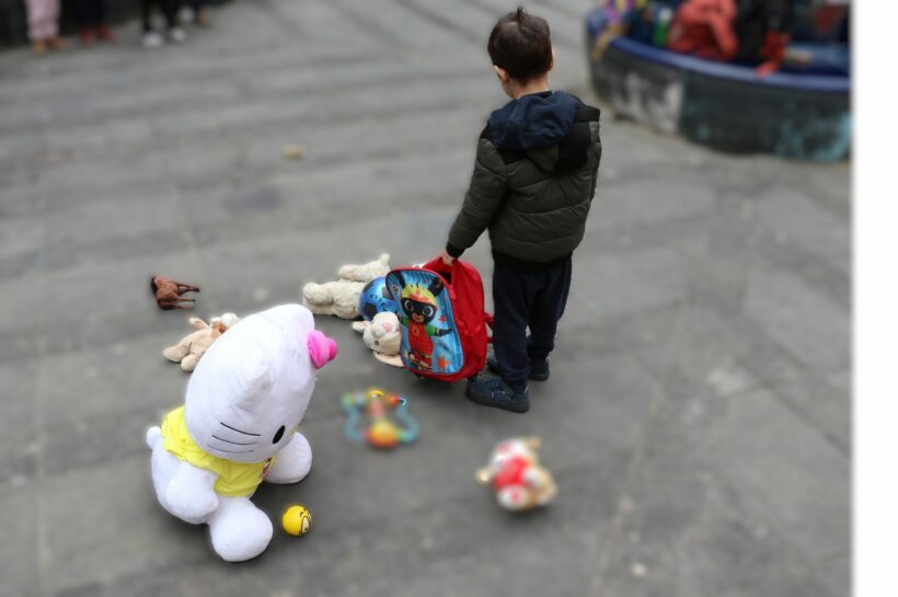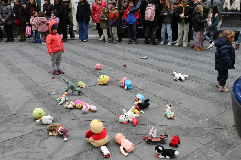 La piazza era viva, attraversata da sguardi attenti, parole sottovoce, sorrisi discreti e dalle risate dei bambini, forse ignari del momento. I giocattoli, pelouche, costruzioni, pupazzetti, palle, poggiati a terra con cura. Alcuni incartati, altri accompagnati da biglietti scritti a mano. C’era chi li teneva stretti tra le mani, quasi a proteggerli fino all’ultimo. Una madre ha sussurrato: “È difficile spiegare la guerra a una bambina di cinque anni, ma so che questo gesto resterà”.