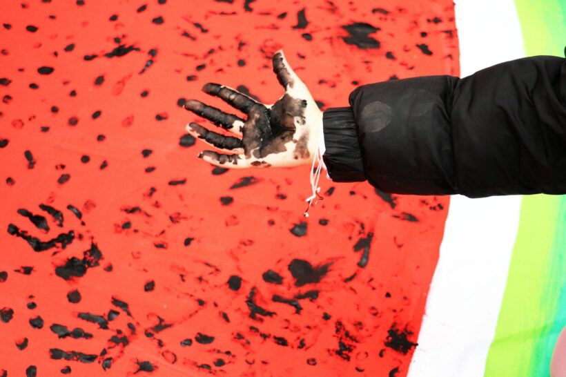Tra i cartelli e i volantini che riportavano i numeri dell’orrore, spiccava al lato della piazza un grande disegno: una fetta d’anguria, colorata con i toni della bandiera palestinese, un simbolo potente e carico di storia. Dopo il 1967, quando la bandiera palestinese fu vietata nei territori occupati, l’anguria ne divenne l’alternativa silenziosa ma inequivocabile: il rosso della polpa, il verde della buccia, il bianco e il nero dei semi e dei contorni. Ancora oggi è un segno di resistenza, identità e opposizione all’occupazione.