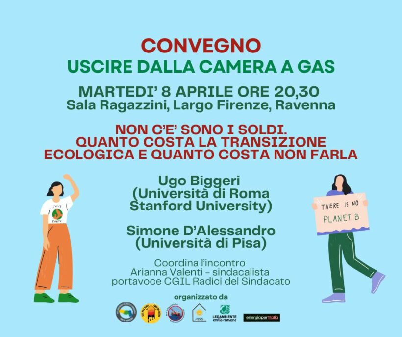 Dopo gli incontri del 3 aprile in Sala Ragazzini e sabato 5 a Palazzo Corradini, dove Federico Maria Butera del Politecnico di Milano e Margherita Venturi dell’Univesità di Bologna (mirabilmente coordinate dalla giovane Francesca Kading, studentessa italoamericana del campus di Ravenna) hanno compiuto una vera e propria opera di smascheramento delle false promesse costituite da proposte come l’impianto di CCS o il cosiddetto nucleare di nuova generazione,la rassegna “Uscire dalla camera a Gas”, organizzata da Rete Emergenza Climatica e Ambientale Emilia Romagna, Campagna Per il Clima Fuori dal Fossile, Legambiente Emilia Romagna, Comunità Energetica Rinnovabile e Solidale di Ravenna, Rete No Rigass NoGnl, Associazione Energia per l’ Italia e Assemblea dei Movimenti Ambientalisti e Non Solo Emilia Romagna