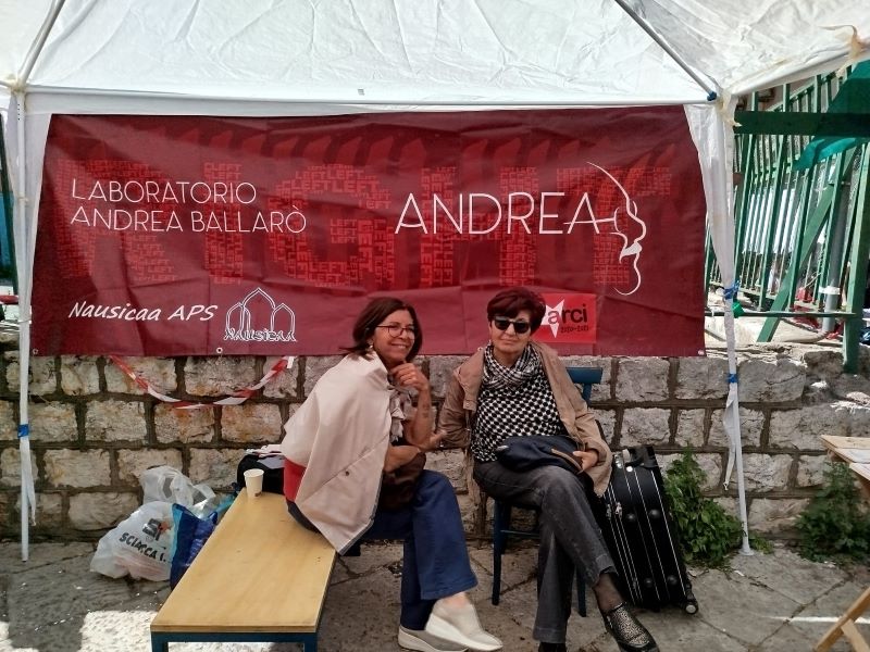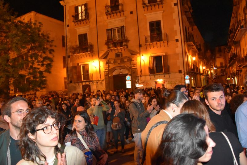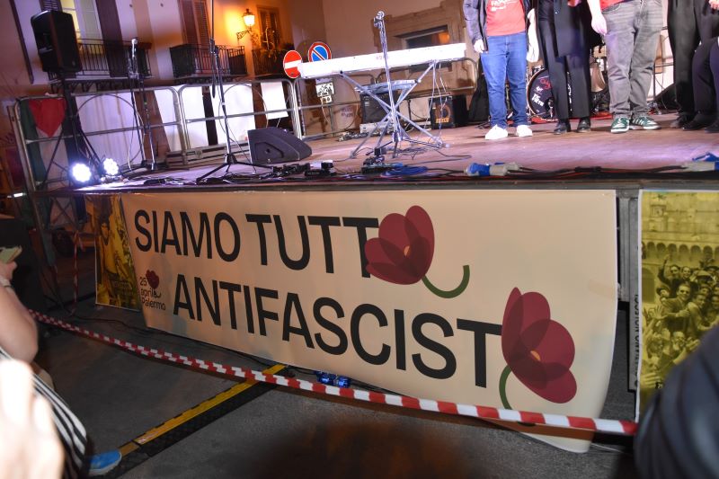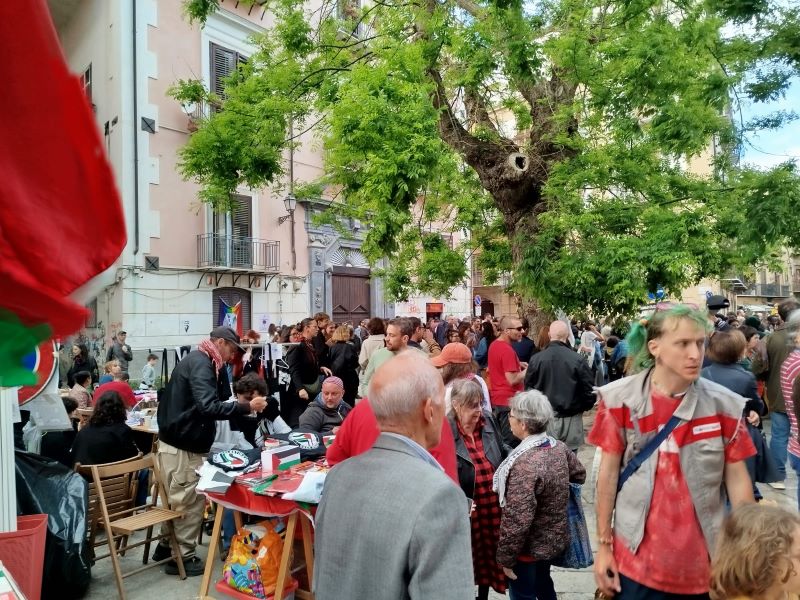 Dopo il coro che intona “Bella Ciao”, ci si sposta a piazza Casa Professa, dove l’ARCI ha organizzato un pranzo all’aperto, nella tradizione nostrana dell’arrustuta sulla brace di carni pesci verdure, e dove sono allestiti spazi di animazione per i bambini, un palco per la musica, una tenda-bar e i banchetti di varie organizzazioni.