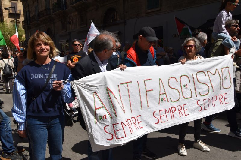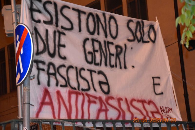 E gli striscioni e i cartelli sono estrosi, satirici oppure di denuncia: colorato con le tinte della Palestina quello del centro sociale Ex Carcere, “L’antifascismo è antisionismo”; rosso quello del neonato Forum No Guerra per la Pace e il Disarmo, che raccoglie diversi e variegati gruppi, “Stop Rearm Europe – Previdenza, Politiche Sociali, Sanità e Istruzione – Non Bombe”. C’è poi l’ironico lenzuolo di NUDM: “Ci sono solo due generi, Fascist3 e Antifascist3”. Apre come sempre l’ANPI: “Partigiani della Costituzione per essere liberi da Fascismo Mafia e Corruzione”.