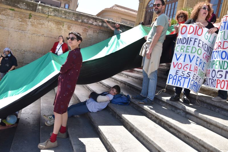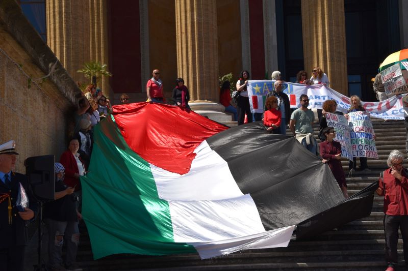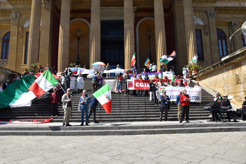 Più di cinquemila in corteo quest’anno a Palermo, forse quasi il doppio, e il bandierone della Palestina sciorinato sulla scalinata del Teatro Massimo per la prima volta!