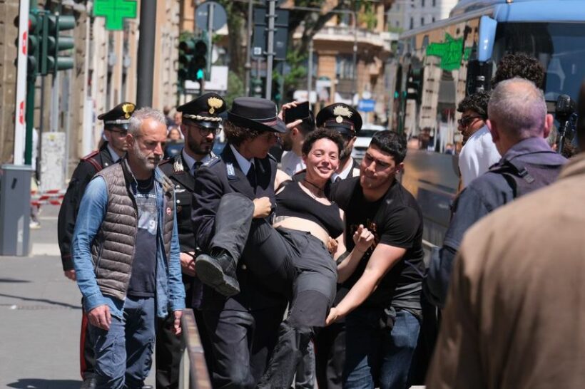 Per sottolineare queste contraddizioni, i manifestanti si sono poi seduti a terra, mostrando cartelli che recitano “Dio è morto … nelle carceri, nei CPR, nel Mediterraneo, a Gaza, nei decreti sicurezza”, un chiaro riferimento alla nota canzone di Francesco Guccini, una delle canzoni di protesta più amate, uscita nel 1965 che, paradossalmente, venne censurata dalla RAI, ma trasmessa invece da Radio Vaticana. Un testo che, evocando i luoghi simbolo del male, i campi di sterminio, parla di un Dio ucciso dall’ipocrisia, dal falso mito della razza, dalla politica fatta di odio e di paura. Una rilettura in chiave attuale, quindi, quella di Extinction Rebellion, che elenca i luoghi dove oggi le persone soffrono e muoiono a causa delle scelte politiche in tema di crisi ecoclimatica, migrazioni, sicurezza. “Quegli stessi ministri che hanno promosso politiche distruttive per clima, ambiente e diritti, in questi giorni successivi alla morte di Papa Francesco, hanno dichiarato il loro impegno verso gli ultimi” afferma ancora Ludovica. Tra gli altri si è espresso, appunto, il ministro della Giustizia, Carlo Nordio, che ha dichiarato: “Nella sua grande misericordia era molto sensibile alle sofferenze dei carcerati. Nel suo nome lavoreremo per rendere il sistema penitenziario sempre più umano”.
