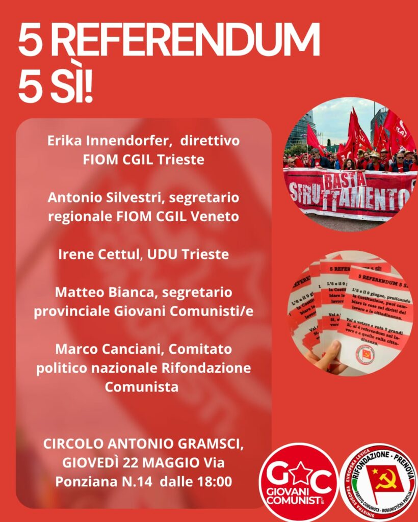 Il Partito della Rifondazione Comunista-Sinistra Europea (TS), insieme ad altre forze, è impegnata a rompere il velo del silenzio che è stato fatto calare sui referendum dell’8 e 9 giugno promossi dalla CGIL (i quattro sul lavoro) e da +Europa (il 5° sulla cittadinanza), cui abbiamo dato pronta adesione. A questo scopo invita a partecipare all’incontro 5 REFERENDUM 5 SI’ che si terrà giovedì 22 maggio alle 18.00 presso la Casa del popolo “Antonio Gramsci” (via Ponziana 14, 1° piano). Interverranno Erika Innendorfer (direttivo FIOM-CGIL Trieste); Antonio Silvestri (segretario regionale FIOM-CGIL Veneto); Irene Cettul (UDU Trieste); Matteo Bianca (segretario provinciale TS Giovani Comuniste/e; Marco Canciani (Comitato Politico Nazionale Rifondazione Comunista).