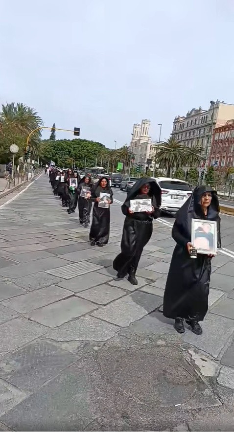 Di seguito, davanti al porto, il “Presidio Permanente del Popolo Sardo” ha dato via al corteo funebre, con medici e paramedici in camice bianco e numerose donne vestite in nero recanti ciascuna una foto dei bambini e delle bambine massacrati a Gaza. Un gruppo di esse in mezzo ad alcune bare bianche cantava S’attititu, il lamento funebre tradizionale, in questo caso davvero straziante. Raffigurazione straordinaria del crimine perpetuato contro il personale sanitario massacrato a Gaza e le migliaia di bambine e bambin uccisi. Più delle parole, parlano le immagini.