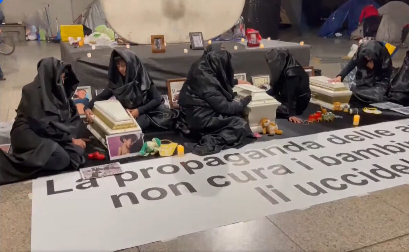 Donne vestite a lutto con immagini di bambini e bambine di Gaza – foto Youtube