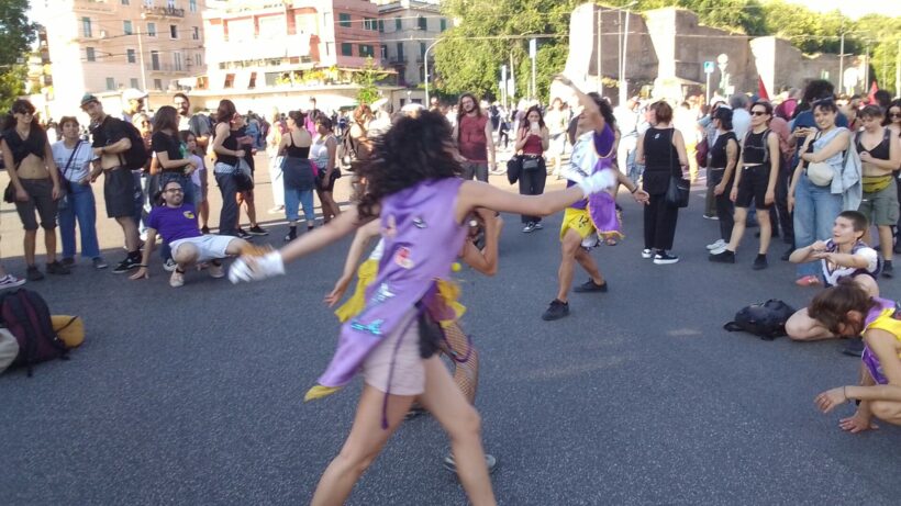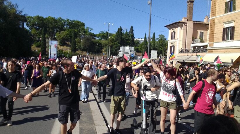Dopo un lungo percorso seguendo le Mura Aureliane, decine di migliaia di giovani e giovanissimi hanno interamente occupato la piazza, riempiendola di colori e della musica sparata a tutto volume dai diversi camion che hanno accompagnato il corteo, che più che marciare ballava libero e scatenato, con la certezza di stare dalla parte giusta della Storia e che il futuro non potrà che appartenere a loro. Un corteo di opposizione politica, sociale e culturale a un governo che senza mezzi termini viene definito reazionario e fascista, a cui non si chiede nulla se non di andarsene (“Te ne vai o no, te ne vai sì o no!”).