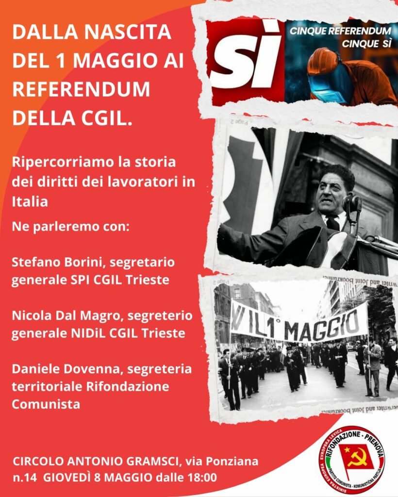 Giovedì 8 maggio alle ore 18.00 presso la Casa del Popolo “Antonio Gramsci”, via Ponziana 14 (Trieste) -1° piano, il Partito della Rifondazione Comunista-Sinistra Europea organizza l’incontro “Dalla nascita del 1° Maggio ai referendum della CGIL”.