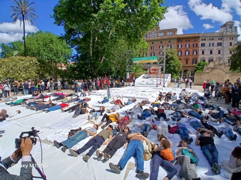 Così titola il post su FB che invitava stamattina a Piazza Vittorio i cittadini romani a portare e stendere un lenzuolo bianco per dare visibilità alla solidarietà con il popolo palestinese.