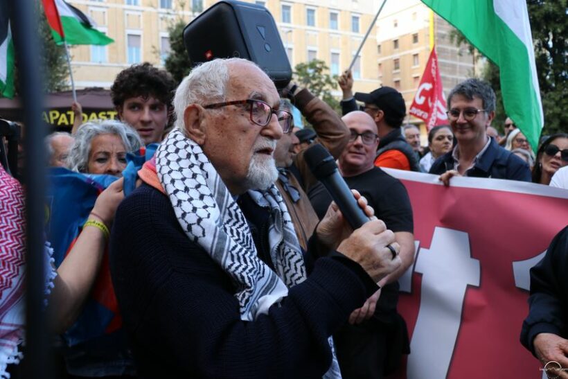 Padre Alex Zanotelli ha aperto il suo intervento con un ringraziamento sentito alla piazza: “Prima di tutto, un grazie a tutti voi che siete scesi in piazza: guardate che le cose non cambiano se noi non ci diamo da fare, se non protestiamo per quello che sta avvenendo.” Poi ha parlato di Gaza con voce angosciata e parole chiare: “Io sono molto angosciato per quello che sta avvenendo a Gaza. Siamo davanti a un genocidio, è inutile che lo neghiamo. C’è ormai la chiara idea di far morire la popolazione.”