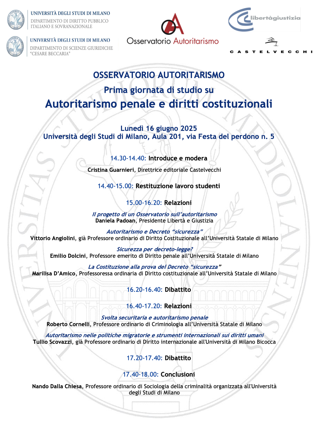 Il focus dell’incontro milanese sarà sul Decreto “Sicurezza”, con Emilio DolciniMarilisa D’AmicoRoberto CornelliTullio ScovazziNando Dalla Chiesa, e un gruppo di lavoro di studenti dell’Ateneo.