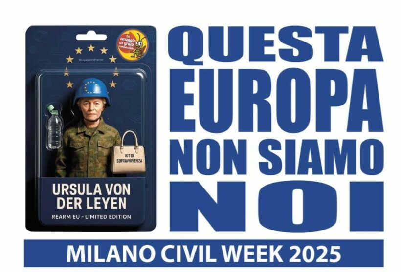 Recita il volantino “Associare il concetto dell’Europa (per ciò che l’Europa sta esprimendo e non per quello che dovrebbe essere) alla manifestazione della Milano Civil Week è una chiara operazione di propaganda… L’Europa siamo noi non è che l’ultimo goffo tentativo, rispetto ad altre recenti e patinate manifestazioni, di associare “(o meglio strumentalizzare) il buono, il bello, il giusto, in questo caso l’operosità, con il meno buono spirito guerrafondaio del Rearm Europe, che sottrae risorse fondamentali ai veri bisogni dei cittadini…”