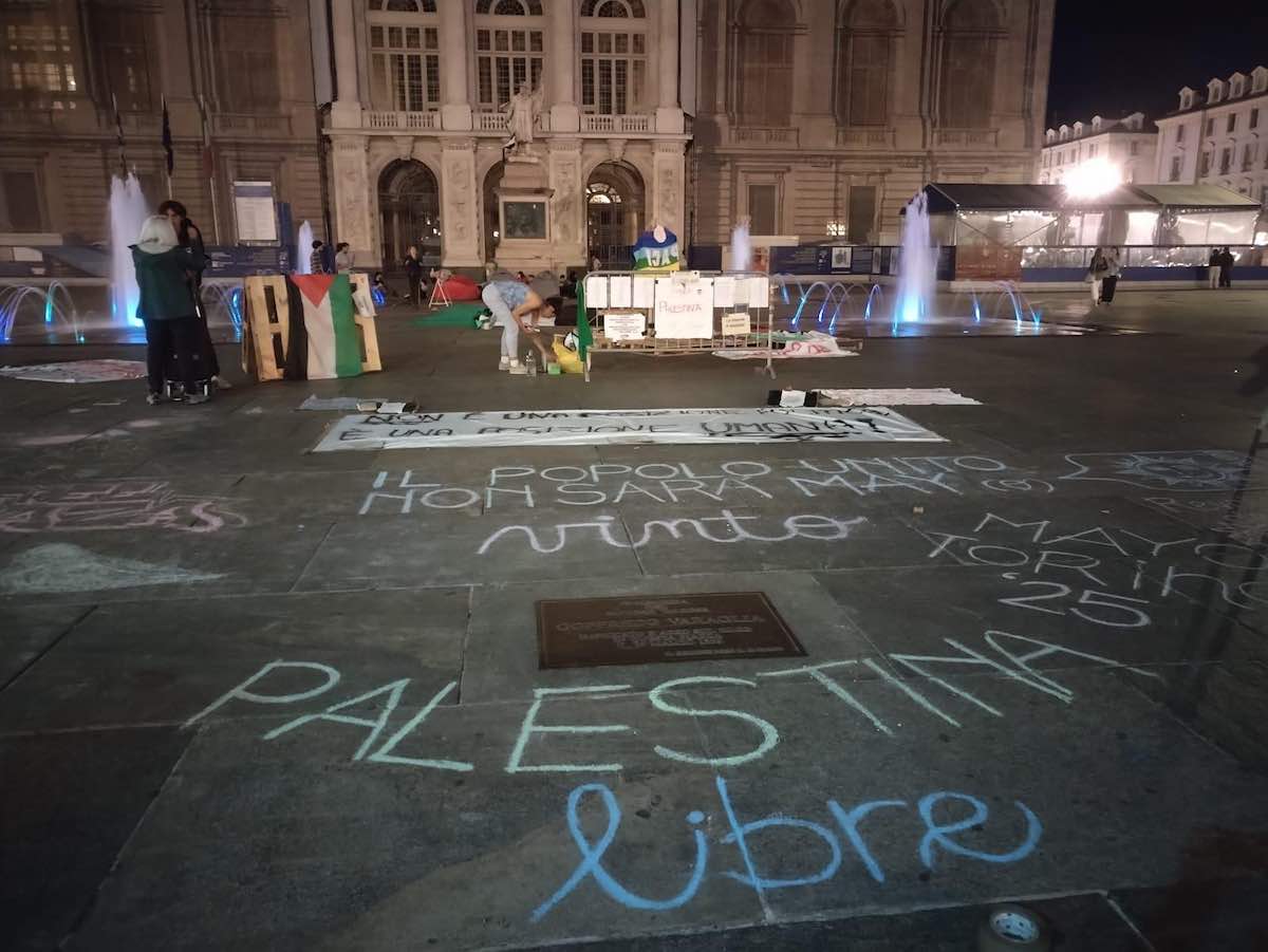 Così ieri sera che era già mercoledì ho provato a rintracciarli per telefono per sapere come andava. “Benissimo. Per un attimo abbiamo temuto che volessero sgomberarci, ma è stato un falso allarme. Ovvero: senz’altro dovremo lasciare Piazza Castello per qualche giorno, in vista delle celebrazioni per il 2 giugno, ma solo per spostarci in Piazza San Carlo. Anzi ci hanno detto che potrebbero esserci altre piazze pronte ad accogliere presidi analoghi al nostro. Piazza Carignano, Piazza Vittorio Veneto… che sarebbe proprio il massimo. Così potremo leggere brani di Se questo è un uomo di Primo Levi di fronte ai Murazzi! Ci stiamo accordando con altri gruppi di potenziali presidianti… speriamo nel maggior numero di piazze intitolate alla Palestina, magari non solo a Torino… ti mando il nostro Comunicato Ufficiale, per favore fai girare …”
