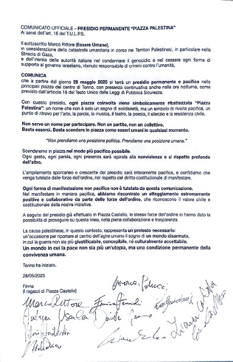 che a partire dal giorno 28 maggio 2025 si terrà un presidio permanente e pacifico nelle principali piazze del centro di Torino, con presenza continuativa anche nelle ore notturne, come previsto dall’art. 18 del Testo unico delle Leggi di Pubblica Sicurezza.