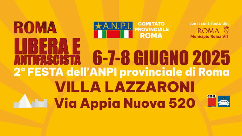In prossimità dell’81° anniversario della Liberazione di Roma dal nazifascismo (4 giugno 1944) il 6,7 e 8 giugno si svolgerà a Villa Lazzaroni la 2^ Festa dell’ANPI provinciale di Roma, con il contributo del VII Municipio e la partecipazione della CGIL di Roma e del Lazio, della libreria Blueroom e dell’AAMOD.