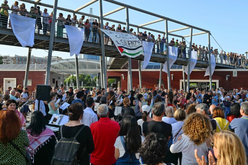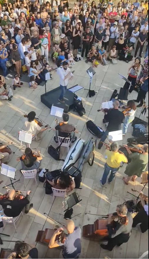 Ore 18:30: inizia il concerto, sulle note del “Dies Irae” dal Requiem di W. A. Mozart, a seguire il “Lacrimosa”, per ricordare e omaggiare le vittime di Gaza. “Mawtini” e “Fid’i”, inni palestinesi. Una poesia e poche altre parole, poi si prosegue con Verdi, “Patria oppressa” dal Macbeth e Imagine di John Lennon, ormai inno internazionale di pace e speranza, particolarmente amato dal popolo palestinese. Infine, “Bella Ciao”, canto di Resistenza.