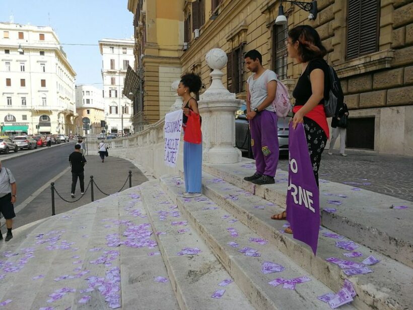 Il movimento BRUCIAMO TUTTO ha compiuto un’azione di resistenza civile nonviolenta. Alle ore 9.45 quattro attivistᴈ si sono recatᴈ presso l’ingresso del Ministero dell’Economia e delle Finanze. Una di loro ha srotolato uno striscione che riportava il nome della campagna “un Reddito per USCIRNE”, e ha dichiarato l’inizio e l’intento dell’azione nonviolenta. Le altre due persone, nel frattempo, hanno buttato in terra una grande quantità di finte banconote da 0 euro di colore lilla. Subito dopo aver buttato le finte banconote una delle persone ha srotolato uno striscione con la scritta “6489 domande. Solo 2772 accolte. Le altre?”. Alle ore 10.19 sono arrivate le forze dell’ordine e hanno identificato lᴈ attivistᴈ che sono state denunciate e trattenute in loco