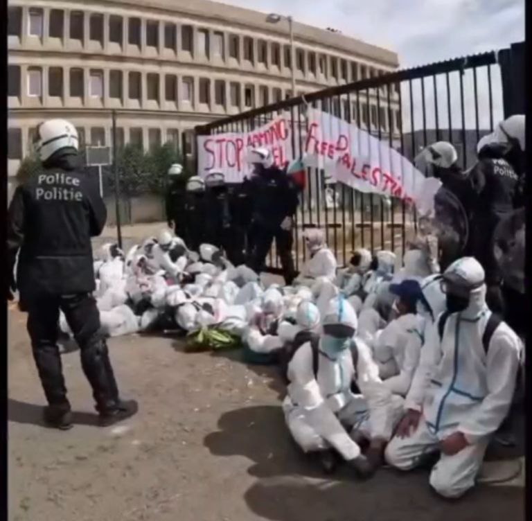 Ieri è stata anche una giornata di arresti, perché gli attivisti di Stop Arming Israel hanno bloccato una fabbrica che produce sistemi per droni chiamata Syensqo e un sito di produzione militare a Tournée, sempre in Belgio; in centinaia, vestiti con le tute da lavoro bianche usate nelle centrali nucleari, hanno circondato la fabbrica, mentre alcuni entravano nei capannoni e con la vernice scrivevano su tutti i muri Save Gaza, Stop Genocide e Viva Palestina.