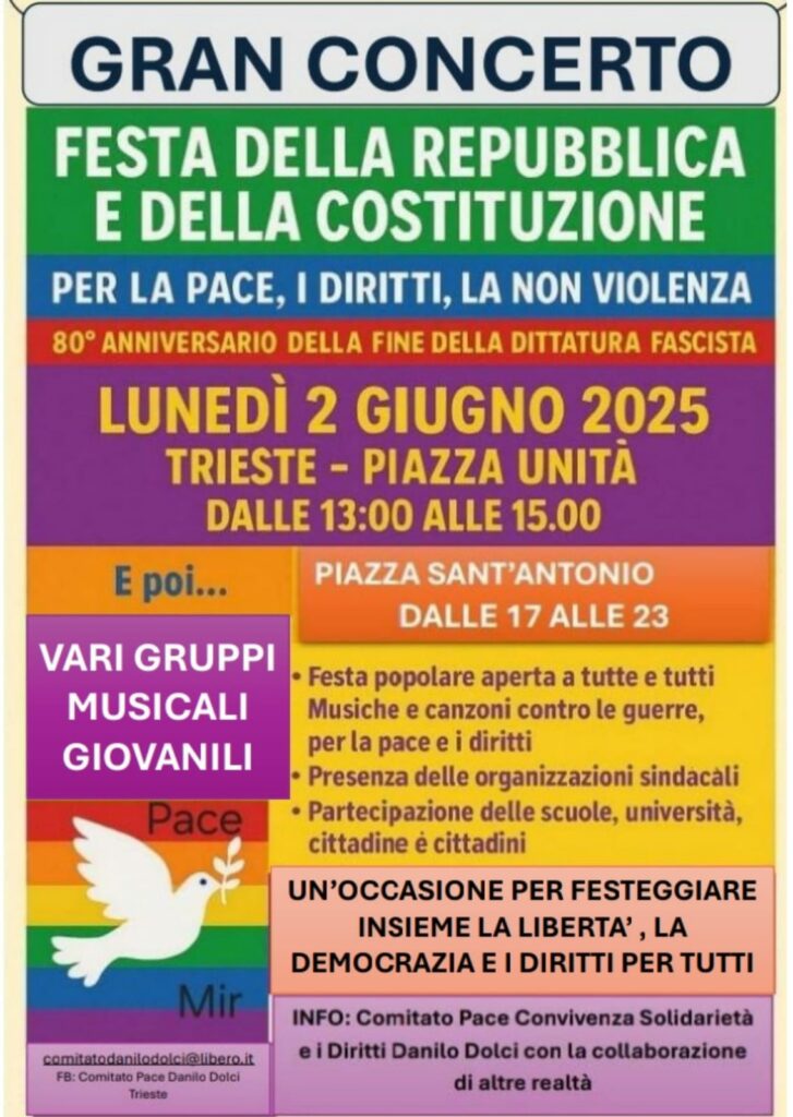Nel pomeriggio, in Piazza Sant’Antonio, a partire dalle 17.00 proseguirà la festa popolare della Repubblica con un concerto per la pace / koncert za mir . Musica dal vivo con i gruppi musicali e la sagra delle ciliegie che saranno disponibili in assaggio. Verrà anche allestito un tavolo con materiale informativo sui quesiti del referendum dell’8 e 9 giugno.