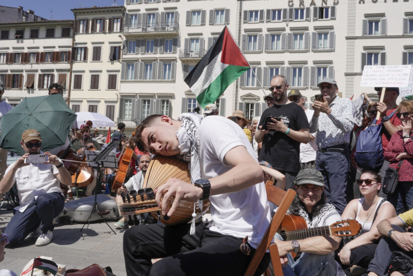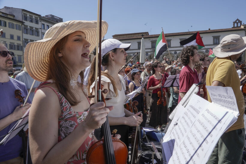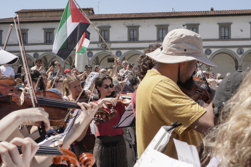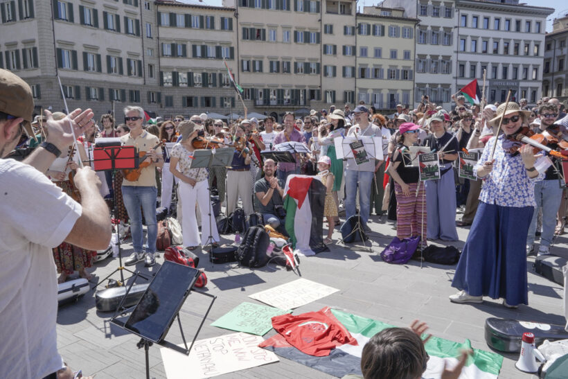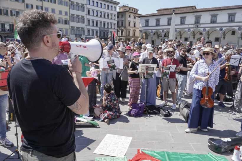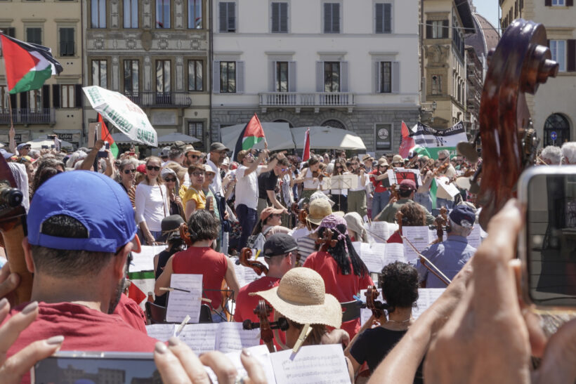 In una mattinata già pienamente estiva in piazza Santa Maria Novella a Firenze, il luogo dove si tengono puntualmente tutte le iniziative non istituzionali per la Palestina, un’orchestra eterogenea ha tenuto un concerto – La musica contro il silenzio. Contro l’apartheid e il Genocidio in Palestina – come si legge sulla locandina diffusa online.