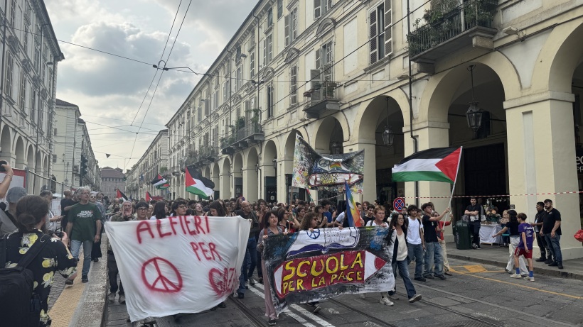 Un lungo corteo, alcune migliaia di partecipanti, sfila nel pomeriggio lungo le vie di Torino, partito dalla centrale piazza Castello e, poi, in via Po, nell’ampia piazza Vittorio Veneto, sino a raggiungere il parco del Valentino. Insegnanti, studenti, qualche dirigente scolastico, famiglie, ma anche cittadini sollecitati a camminare per Gaza, a dare voce a un disagio profondo dinanzi al massacro, reiterato e largamente ignorato, dei gazawi. Giovedì 5 giugno, tra bandiere della pace e della Palestina, slogan – «la scuola lo sa da che parte stare», «basta genocidio», tra gli altri – e canti, una parte del mondo della scuola e della società civile torinesi ha manifestato la propria indignazione davanti al genocidio, la propria contrarietà dinanzi al lungo silenzio attorno a quella che ancora ci si ostina a chiamare guerra e che guerra non è: è un massacro di civili dietro il paravento comodo dell’estirpazione di Hamas.