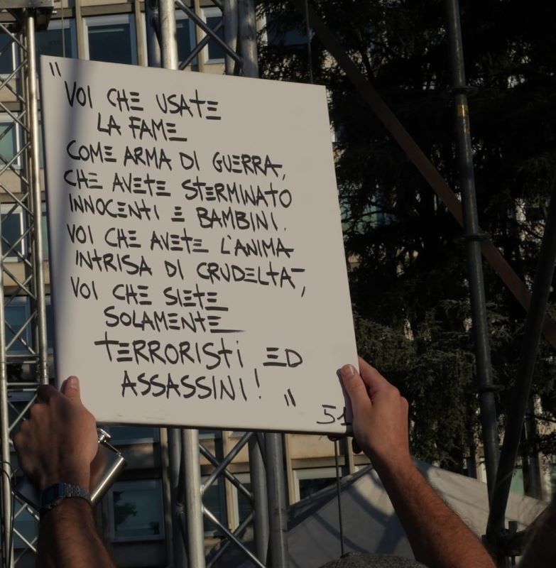 É quindi la volta dei Gemitaiz, Frenetika and Orang3. I vari interventi dal palco denunciano il silenzio vile della “Madre Italiana e Cristiana” Meloni. La Storia non perdonerà mai lei e Tajani ed il 90% dei giornalisti italiani, scorta mediatica del Genocidio.