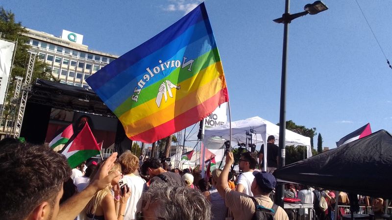 Seguendo le indicazioni del comitato promotore che fa capo all’organizzazione Schierarsi, non ci sono in piazza bandiere di partito, ma innumerevoli bandiere palestinesi ed alcune bandiere arcobaleno e della Pace.