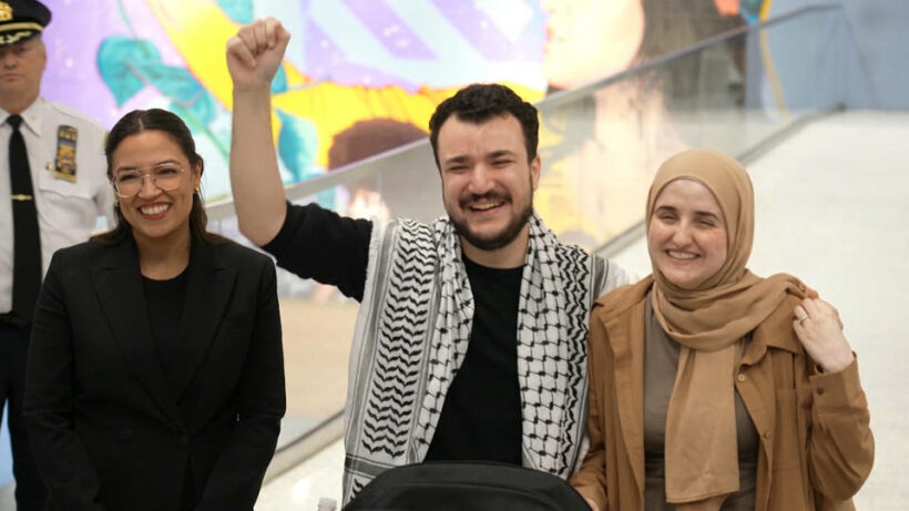 Mahmoud Khalil, laureato alla Columbia University e leader della protesta studentesca pro Palestina, si è riunito alla moglie e al figlio neonato una volta rilasciato su cauzione da un giudice federale venerdì scorso, dopo oltre 100 giorni di detenzione in un carcere dell’Immigration and Customs Enforcement (ICE) della Louisiana. Era stato sequestrato dagli agenti federali a marzo, diventando il primo manifestante filo-palestinese del campus a essere incarcerato dall’amministrazione Trump. Mahmoud Khalil ha parlato brevemente sabato dopo il volo dalla Louisiana al New Jersey.