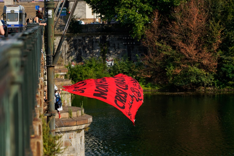Questo pomeriggio due persone, munite di corde ed imbraghi, si sono calate dal ponte Vittorio Emanuele I a Torino, e vi hanno esposto uno striscione riportante “38°C a giugno: non è caldo è crisi climatica”. Nel frattempo, altre distribuivano volantini a forma di ventagli lungo i Murazzi lì accanto, diventati ormai il simbolo del torrido inizio di quest’estate.