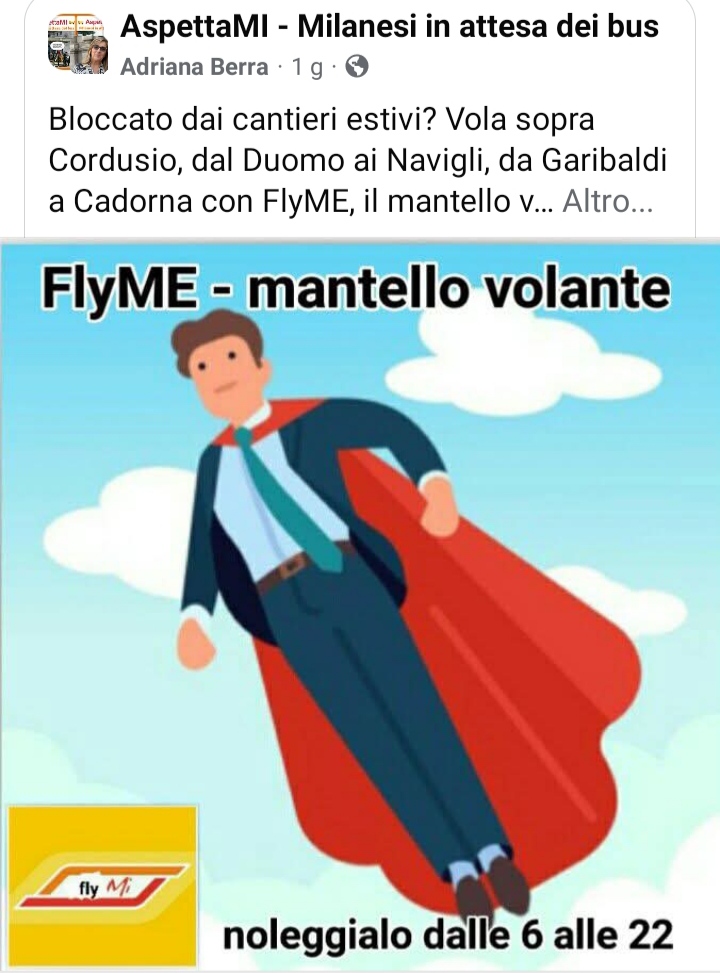 Vista la difficoltà che i cittadini trovano nell’aggirare questi “blocchi”, nel gruppo Facebook AspettaMI è stata ironicamente lanciata una nuova proposta per la mobilità dolce: FlyMe, un mantello volante noleggiabile dalle 6 alle 22.