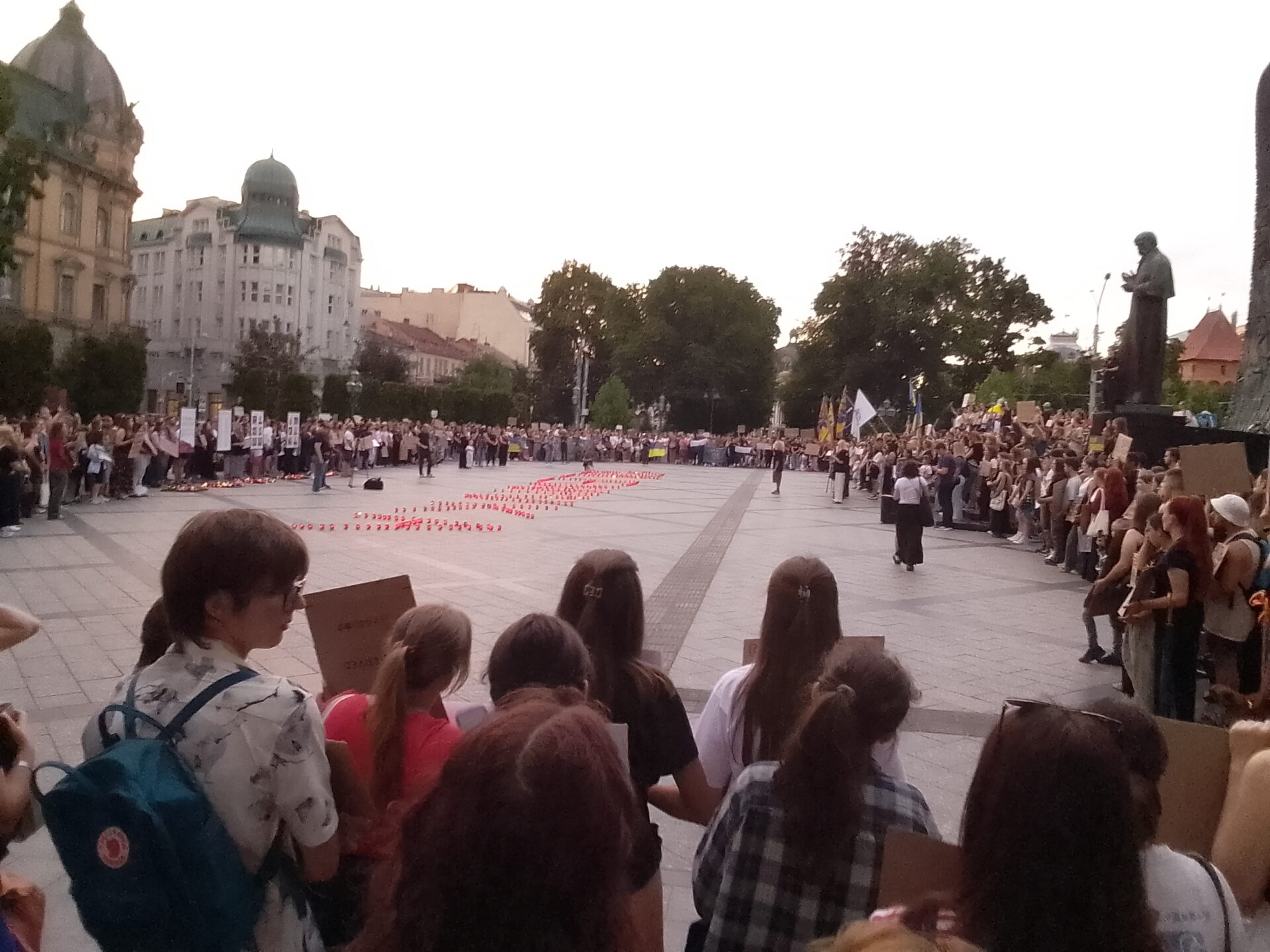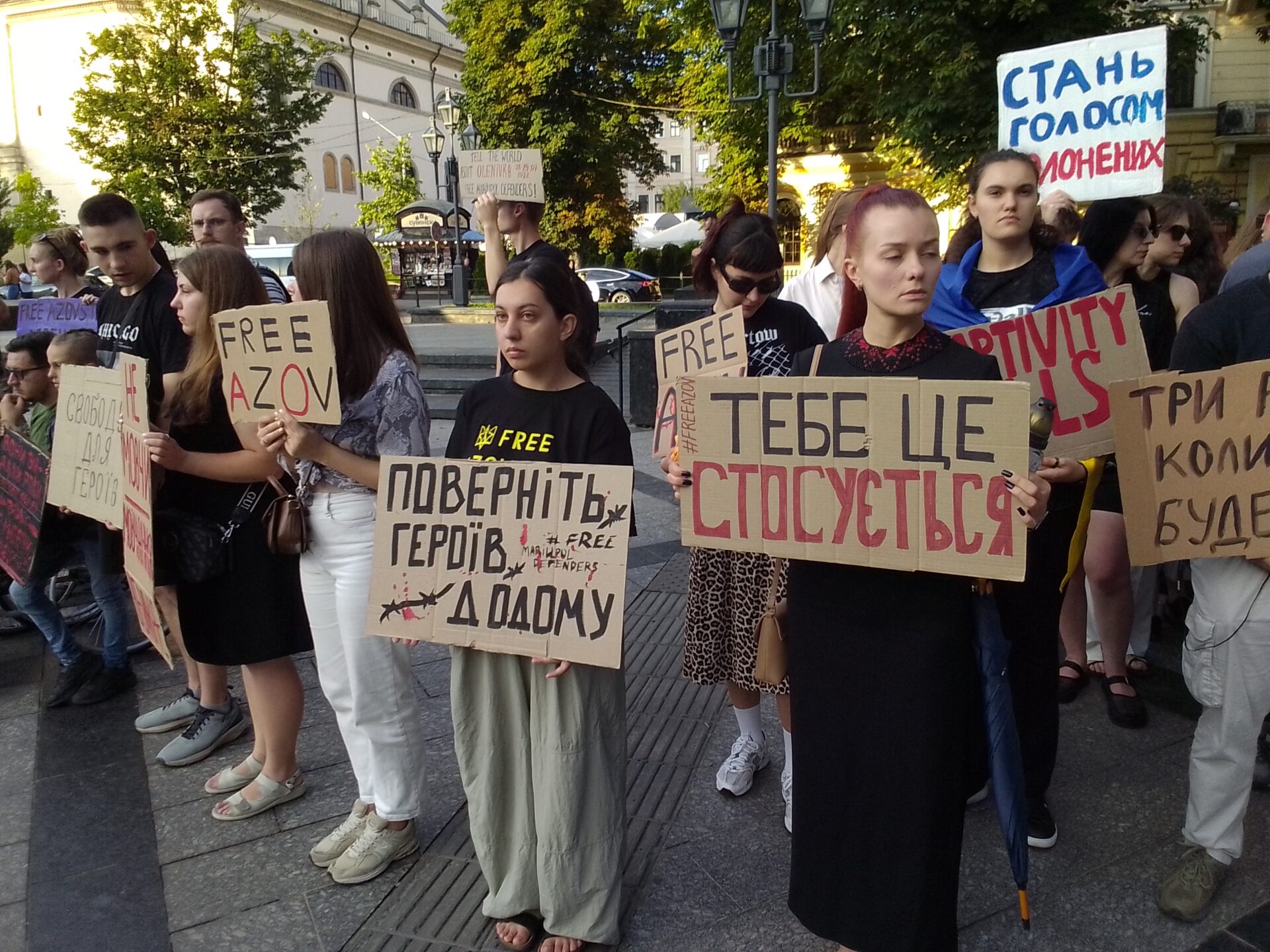 Non nerboruti skinheads tatuati con svastiche, ma gente assolutamente comune: giovanissimi con i capelli colorati, donne, uomini, famiglie intere con bambini piccoli. Tutti reggevano cartelli di cartone, striscioni e bandiere (queste erano il segno più inquietante) che chiedevano a gran voce, riuniti intorno ad una grande scritta formata da lumini, “la liberazione dei nostri difensori: i coraggiosi miliziani del Battaglione Azov fatti prigionieri dei russi durante la difesa e conquista di Mariupol'” !!!