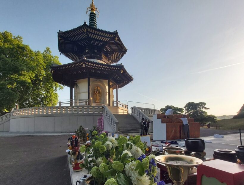 Londra quest’anno è stata benedetta da un clima insolitamente mite, tanto che non abbiamo avuto bisogno delle giacche che avevamo portato. Il prato intorno alla Pagoda della Pace nel Battersea Park era pieno di persone che si godevano il sole, creando una scena pacifica. Il giorno della cerimonia, il cielo sembrava rispondere alle nostre preghiere coprendoci con nuvole sottili che servivano come protezione solare naturale. Quella mattina, la marcia interreligiosa per la pace guidata da Bhikkhu Kamoshita, che era partita da Trafalgar Square verso la Pagoda della Pace, arrivò come previsto senza essere esposta alla luce solare intensa.