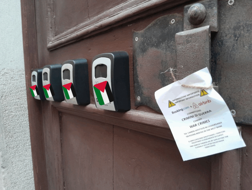 Oggi , 27 Agosto 2025, a Trieste un gruppo di cittadine e cittadini ha attaccato ai lucchetti portachiavi degli appartamenti affittati da booking e Airbnb dei volantini informativi su come queste due aziende traggono profitto da crimini di guerra.