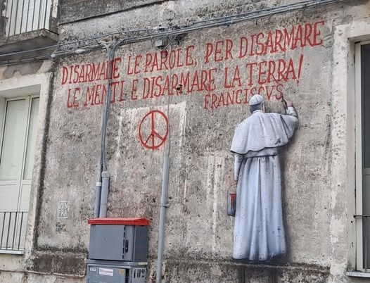 Questo particolare murales, che è un’opera di Vincenzo Franco, raffigura papa Francesco I mentre, come un giovane graffittista, scrive su un muro DISARMARE LE PAROLE, PER DISARMARE LE MENTI E DISARMARE LA TERRA.