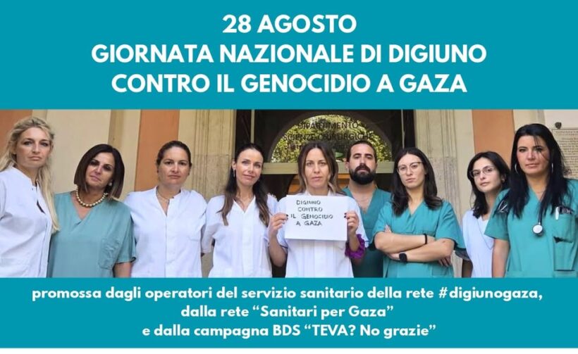 L’appuntamento è per il 28 agosto, giornata nazionale del digiuno degli operatori e operatrici del servizio sanitario per protestare contro il genocidio che si sta perpetrando a Gaza e dell’intero popolo palestinese. L’iniziativa, partita il 29 luglio scorso in Toscana, con il digiuno a staffetta che ha coinvolto oltre 4 mila persone, ha oltrepassato i confini toscani ed ha raggiunto tutte le regioni con la pronta adesione di “Sanitari per Gaza”, Medicina Democratica e “BDS Teva? No grazie!”.