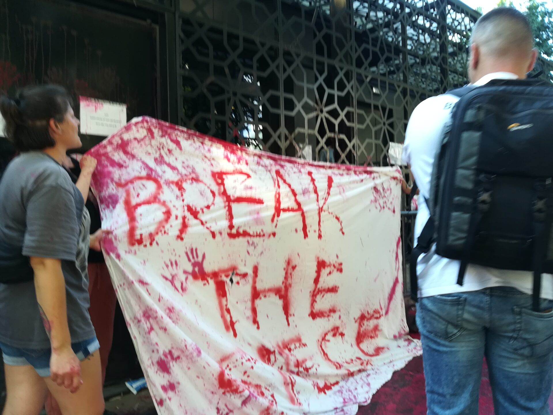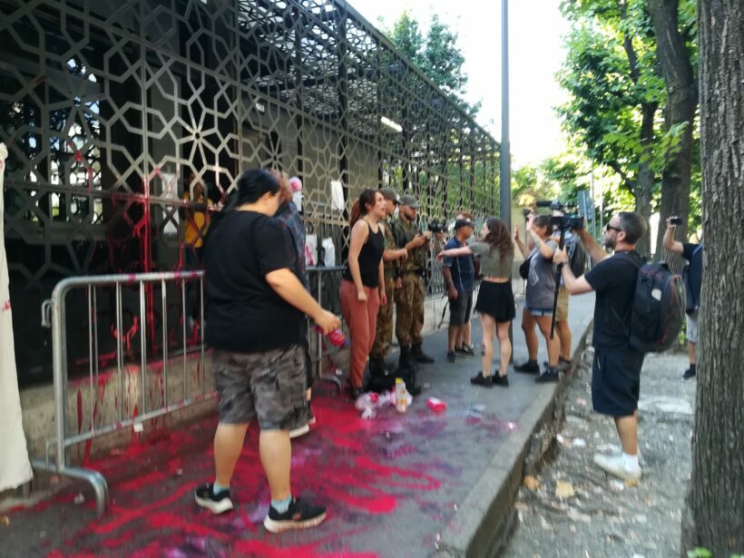 Questo pomeriggio, intorno alle ore 18.00 dieci persone aderenti ai movimenti Palestina Libera e Ultima Generazione hanno lanciato vernice rossa contro l’ingresso dell’ambasciata egiziana; successivamente hanno mostrato uno striscione con scritto Break the siege (“rompere l’assedio”) e attaccato alla recinzione dell’ambasciata foto di persone palestinesi uccise nel corso delle operazioni di guerra dell’esercito israeliano.