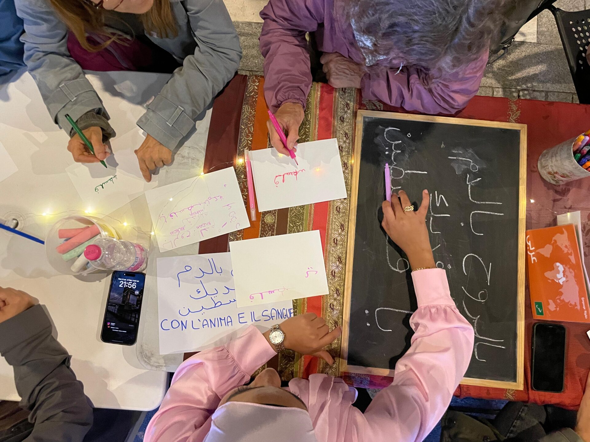 È stato allestito, come ormai di abitudine, lo spazio per i bambini e le bambine: una tovaglia distesa a terra e diversi fogli e colori per dare spazio alla loro fantasia e al loro modo di comunicare solidarietà ai piccoli di Gaza.