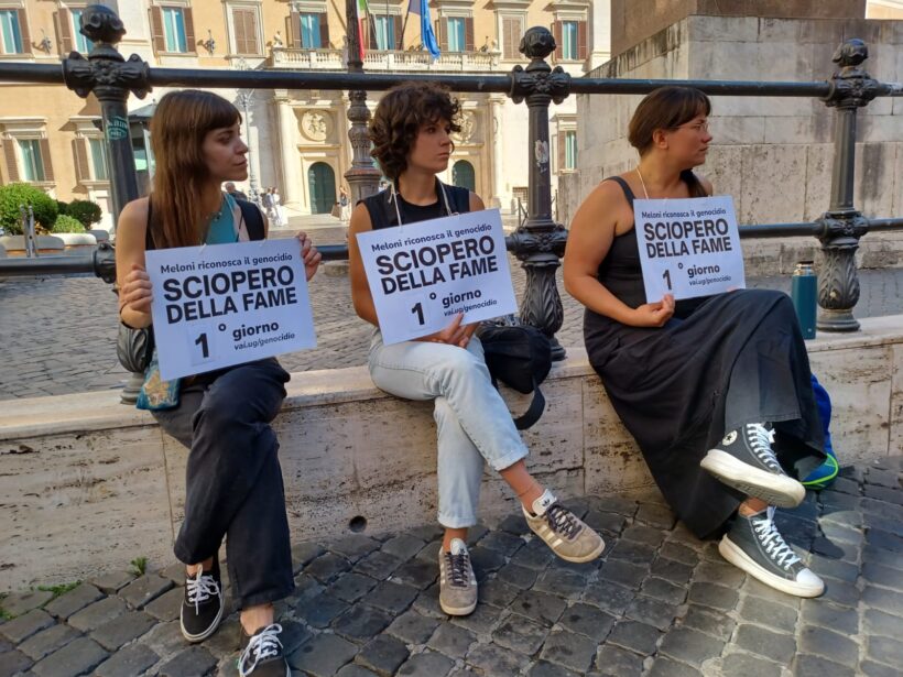 Roma, 20 settembre 2025 – La scena è stata di una semplicità disarmante: tre donne in sciopero della fame sedute dietro l’obelisco in piazza Montecitorio, con un cartello in mano. Nessun gesto eclatante, nessuna tensione, nessuna forzatura. Eppure, nel giro di pochi minuti, un intervento massiccio delle forze dell’ordine le ha portate via, insieme a chi documentava con una videocamera. Un episodio che ha trasformato un momento pacifico e silenzioso in un atto repressivo: non è accaduto nulla, eppure è accaduto tutto. Ricordiamo che è il nostro Governo che è stato denunciato dalla Corte Penale Internazionale per complicità nel genocidio. Eppure, paradossalmente, sono proprio i cittadini che osano nominarlo a ritrovarsi allontanati e denunciati. È fondamentale comprendere la gravità di quanto accaduto: non possiamo considerare normale che il richiamo a doveri giuridici e morali comporti denunce per cittadini comuni, mentre il governo denunciato rimanga esente da responsabilità.