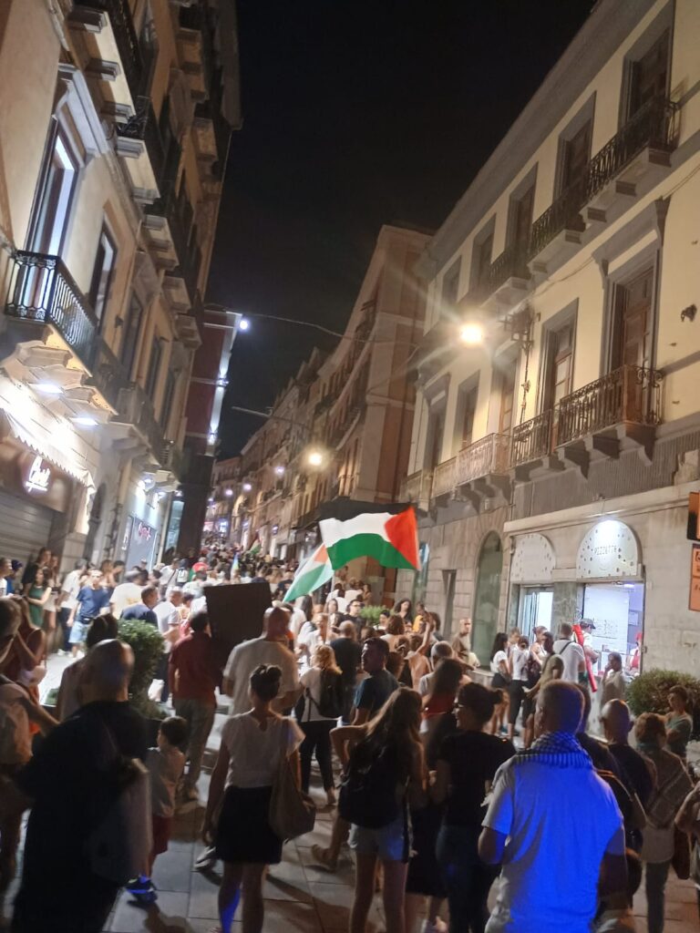 Da piazza del Carmine il corteo, ancora più rumoroso, ha proseguito fino al Corso Vittorio Emanuele, passando in mezzo ai turisti seduti ai tavolini. Al passaggio dei manifestanti sull’ingresso di un locale è stata esposta la bandiera della Palestina. Percorsa la via Manno si è proseguito per via Garibaldi per poi concludere alla alla scalinata del Bastione con l’unico slogan gridato all’unisono:”Palestina libera!”.