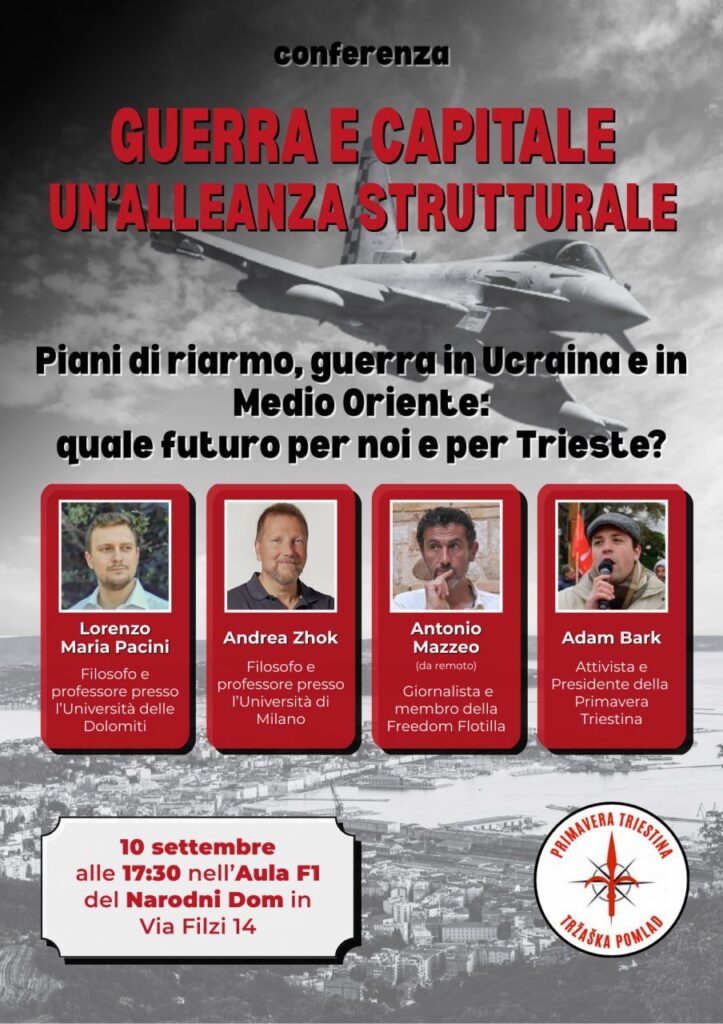 Nel corso dell’incontro verranno affrontate diverse questioni: dal rapporto esistente tra capitalismo e guerra a ciò che accade in Palestina, fino ad arrivare alla situazione di Trieste e del suo porto – che costituisce una risorsa molto preziosa vista la sua posizione strategica – nella mutata situazione geopolitica mondiale.