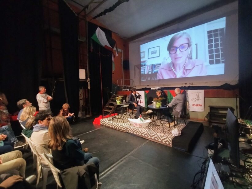 Il passaggio che fa Albanese è un passaggio fondamentale, lei parla di un passaggio dall’economia dell’occupazione all’economia del genocidio e noi siamo dentro questa strettoia, noi siamo dentro questo passaggio. La crisi di questo sistema e i cambiamenti nella condizione del resto del mondo, il resto del mondo che si affaccia finalmente alla scena, hanno portato l’Occidente a una reazione sproporzionata, una reazione scomposta, violenta, brutale e in parte irrazionale, perché noi fatichiamo a trovare il senso in questa reazione. L’attacco alla Russia attraverso il conflitto in Ucraina, la scelta della soluzione finale per la Striscia di gaza da parte di Netanyahu, è l’economia che passa da capitalismo predatorio a capitalismo di guerra, da economia dell’occupazione, come dice Albanese, a economia del genocidio. Ma io vi invito a riflettere su questo, perché questo è la cosa che vi voglio dire, perché è un punto debole in realtà: io sono convinta che questa volontà di trascinarci in guerra e di instaurare un regime di guerra, che la volontà di perpetrare un genocidio, sia il frutto di un’estrema debolezza, sia davvero l’ultima spiaggia di un intero sistema e noi, il movimento della Pace, dobbiamo essere coloro che a questo sistema marcio, corrotto, violento e schifoso gli diamo una spallata. Io credo che noi dobbiamo avere questo obiettivo, noi dobbiamo rovesciare il sistema di guerra, noi dobbiamo essere una rivoluzione.