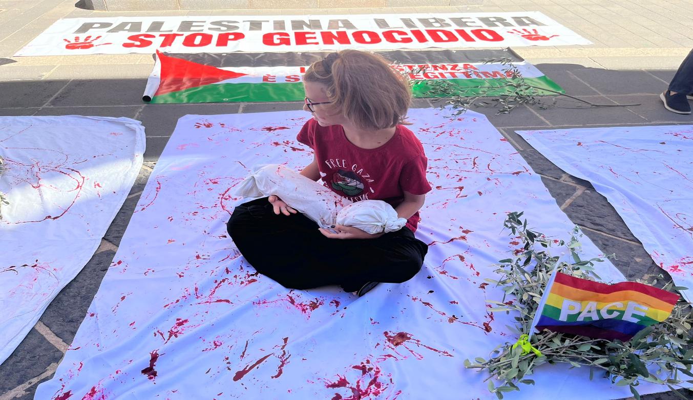 Sabato 20 settembre davanti alla Prefettura cittadina si è svolto un “colorato” e sentito sit-in a sostegno del popolo palestinese, vittima da poco meno di un secolo di una pulizia etnica (per lo meno così la chiama lo storico israeliano Ilan Pappé in uno dei suoi più famosi volumi sul tema La pulizia etnica della Palestina); i volontari organizzatori si sono impegnati per rendere l’evento partecipato e soprattutto perché avesse un forte significato simbolico. E’ stata organizzata una solenne e sentita performance: alcuni attivisti rigorosamente vestiti di nero si sono stesi su dei lenzuoli bianchi macchiati di sangue (a testimoniare la violenza di cui il popolo palestinese è vittima da troppo tempo) e circondati da rami di ulivo (simbolo per eccellenza della pace che da più parti si chiede a gran voce).