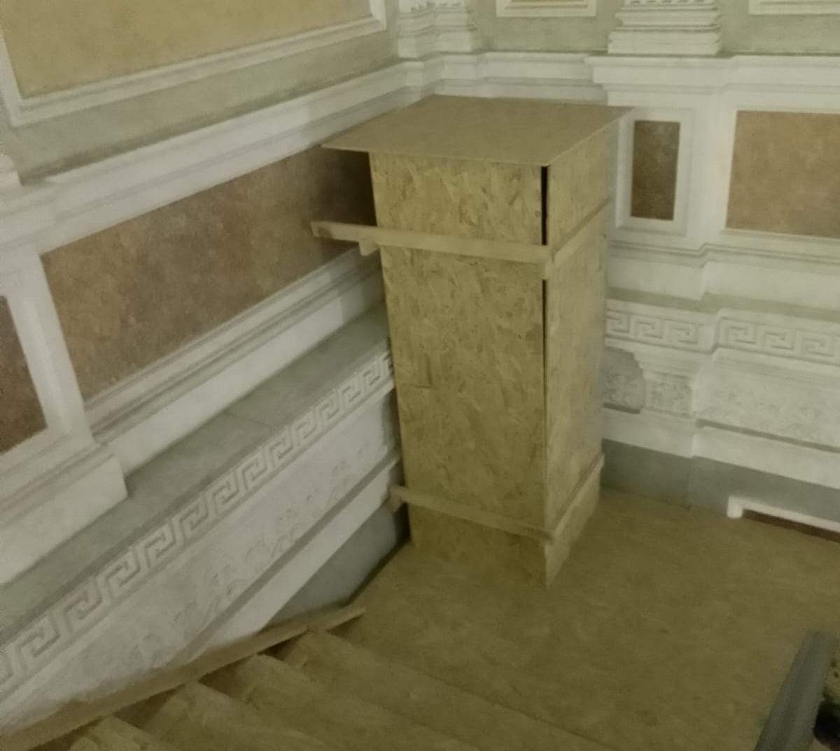 Per proteggere l’edificio, le sue meravigliose sale, i pavimenti, le scalinate, le decorazioni, gli arredi e i beni artistici qui custoditi, tra cui un antico fortepiano, la palazzina e i suoi preziosi interni sono stati “imballati” con pannelli di compensato.